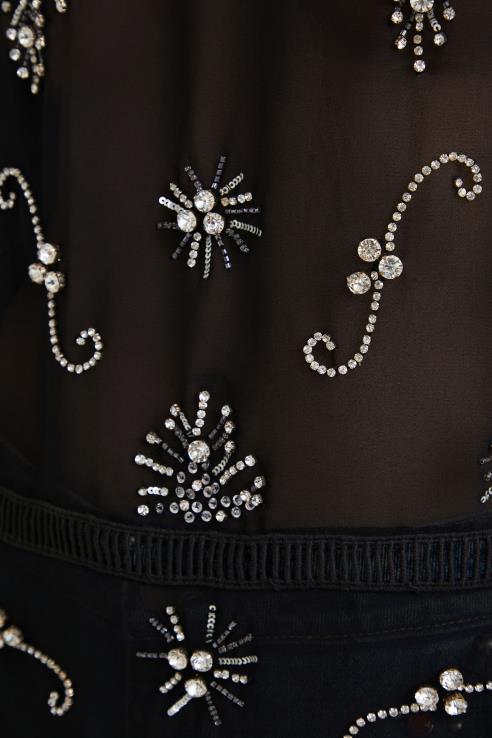 - פאייטים, חרוזים ואבני חן רקומות בחזית כדי ליצור צורות שונות
