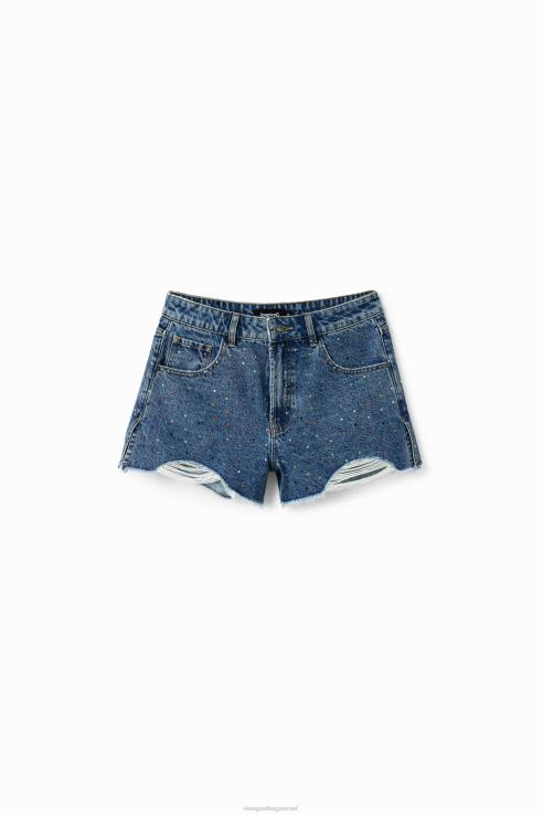 מכנסי ג'ינס קצרים בעלי גזרה בינונית עם אפליקציות מטאליות ססגוניות ומכפלת משופשפת עם שסעי צד.
